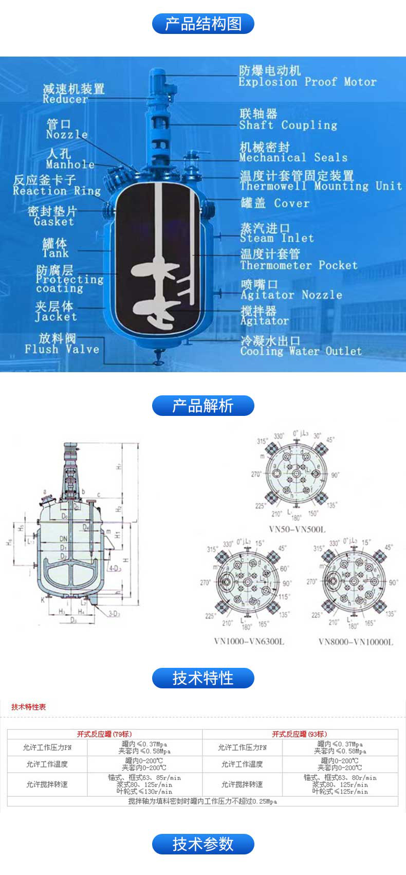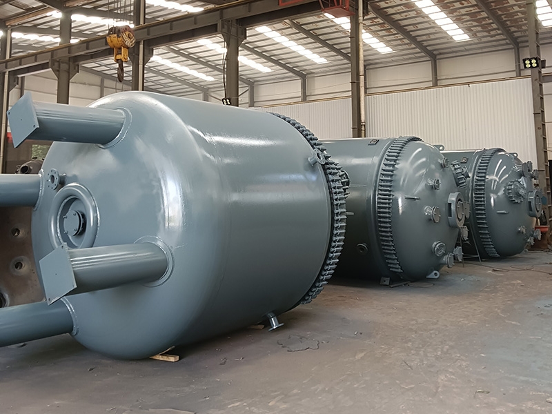 搪瓷反應罐常用于石油化工、橡膠、農(nóng)藥、染料、醫(yī)藥等行業(yè),用以完成磺化、硝化、氫化、烴化、聚合、縮合等工藝過程,以及有機染料和中間體的許多其它工藝過程的反應設(shè)備。低壓反應釜,一般是指1.6MPa以下的反應釜。由于工藝條件和介質(zhì)的不同,反應釜的材料選擇及結(jié)構(gòu)也不盡相同,但基本組成是相同的,它包括傳動裝置、傳熱和攪拌裝置、釜體(上蓋、筒體、釜底)、工藝接管等。設(shè)備的外觀尺寸,一般取反應釜有效高度Hgz/反應釜內(nèi)徑Di=1.0~1.2,如果Hgz/Di>1.5,則需增設(shè)槳葉數(shù)。槳葉直徑di通常取1/3/Di,上、下槳葉的間距應略大于槳徑。在設(shè)備的結(jié)構(gòu)上設(shè)置必要的傳熱和攪拌裝置是為了強化反應過程。反應釜體普遍采用鋼制(或襯里)、鑄鐵或搪玻璃。